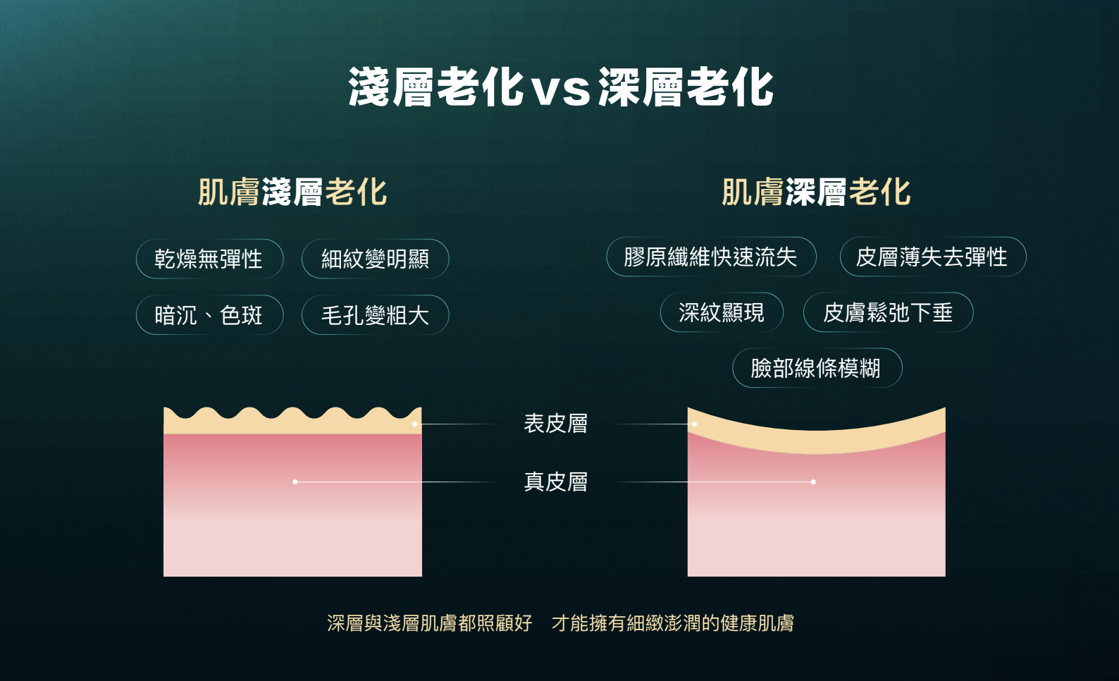 肌膚老化分為淺層老化及深層老化,淺層與深層都照顧好,才能擁有細緻澎潤的健康肌膚。