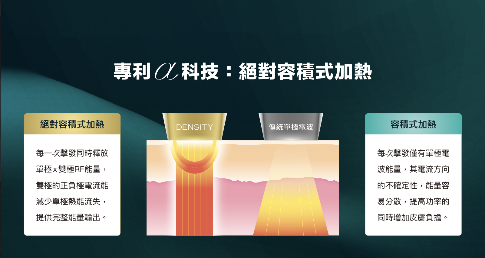 Density 無雙電波採用專利 α 科技,單次擊發同時提供單極與雙極能量,針對真皮淺層(乳突層、網狀層)及深層加熱,促進膠原蛋白重組新生,使肌膚恢復緊緻與彈性。