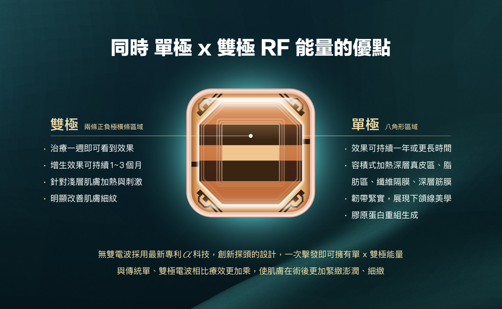 無雙電波採用最新專利 α 科技,透過單極和雙極電流同時作用,加熱皮膚的深層和淺層。利用精準的絕對容積式加熱原理,刺激真皮層生成更多膠原蛋白和彈力蛋白,讓肌膚變得更加緊緻、澎潤,並能有效減少皺紋。